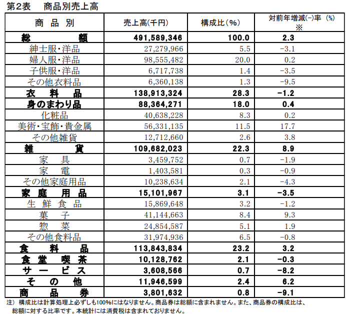 商品別で見ると、主要5品目のうち、身のまわり品が0.4%増、雑貨が8.9%増、食料品が3.2%増と、3つのカテゴリーで対前年プラスだった。