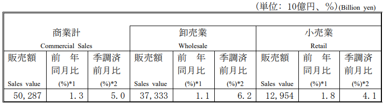 1月商業統計|販売額50兆円1.3%増・うち小売業は12.9兆円1.8%増