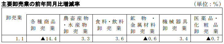 卸売業を業種別にみると、その他の卸売業が前年同月比8.2%増、食料・飲料卸売業が3.6%増、機械器具卸売業が3.4%増、農畜産物・水産物卸売業が3.3%増、繊維品卸売業が1.0%増となった。一方、各種商品卸売業が14.4%減、家具・建具・じゅう器卸売業が7.2%減、建築材料卸売業が4.7%減、衣服・身の回り品卸売業が3.3%減、化学製品卸売業が2.3%減、医薬品・化粧品卸売業が0.7%減、鉱物・金属材料卸売業が0.6%減となった。