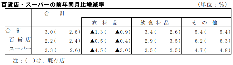 なお、百貨店・スーパーの既存店前年同月比は2.6%増。うち百貨店は2.4%増、スーパーは2.6%増。