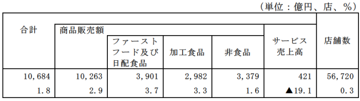 商品別にみると、ファーストフードおよび日配食品が3901億円で3.7%増、加工食品が2982億円で3.3%増、非食品が3379億円で1.6%増となり、商品販売額は1兆0263億円、2.9%の増加となった。またサービス売上高は421億円で、19.1%減少した。
