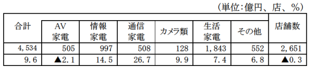 家電大型専門店販売額は4534億円で、前年同月比9.6%増加。