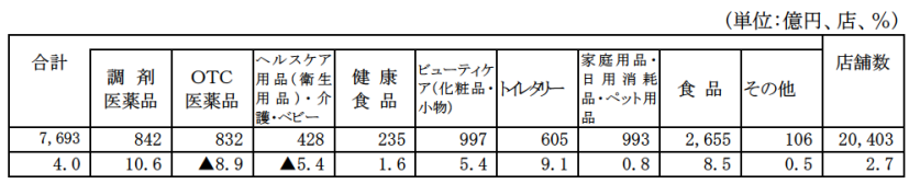 ドラッグストア販売額は7693億円、前年同月比は4.0%増加した。
