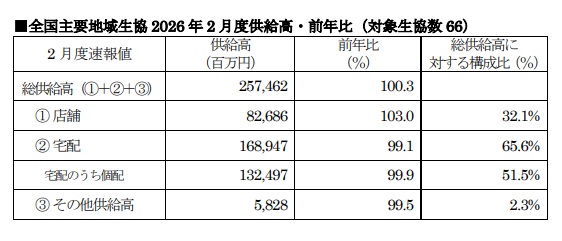 日本生活協同組合連合会(東京都渋谷区、新井ちとせ代表理事会長)が、全国の66主要生協の2026年2月度の供給状況(売上高)を発表した。