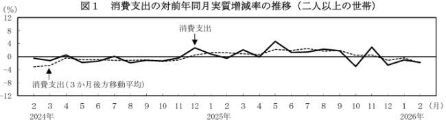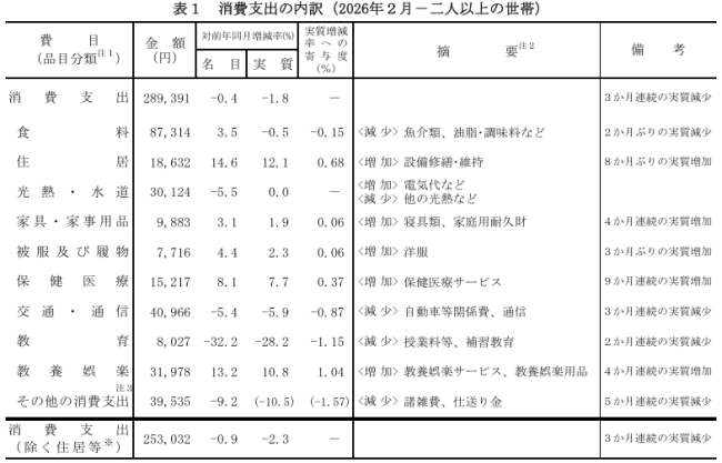 2月家計調査|消費支出1世帯当たり28.9万円で前年同月比実質1.8%減