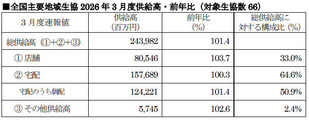 日本生活協同組合連合会(東京都渋谷区、新井ちとせ代表理事会長)が、全国の66主要生協の2026年3月度の供給状況(売上高)を発表した。