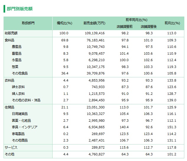 既存店の部門別売上高は、食料品が7618億円(前年同月比101.0%)、衣料品が485億円(93.3%)、住関品が2305億円(101.7%)、サービス 28億円(112.7%)、その他476億円(64.3%)。