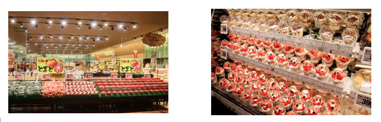 入口すぐの青果コーナーは、近隣市場から仕入れた新鮮で彩り豊かな野菜を取り揃えする。さらに、旬の果物を使用した店内手作りのフルーツパフェや、いちご・みかん・かぼちゃなどの国産冷凍果物・野菜も取り揃えする。