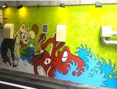 外装は、女性客にも利用しやすいスタイリッシュなデザインを目指し、店舗横の壁面には、ソラノイロをシンボリックに表現した壁画を描いた。