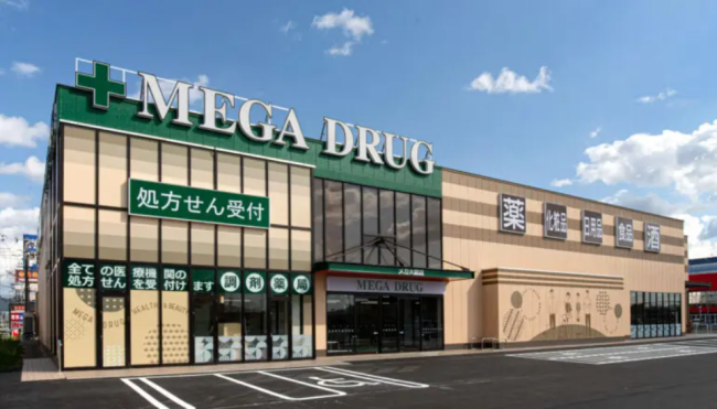 「メガ」は紅屋商事が展開する大型タイプのドラッグストア。大館店は売場面積968坪。ヘルス&ビューティ関連、食品、酒、日用品を品揃えする。特に食品は日配品、冷凍食品など高頻度のカテゴリーを揃える。また、調剤薬局を併設する。