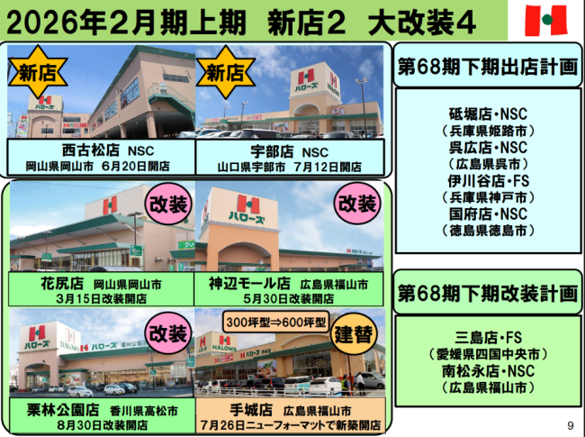 ハローズは2026年2月期に6店舗の新店を計画している。2025年8月までの上期に2店舗をオープンした。下期は4店舖を予定している。9月25日にオープンした砥堀店(兵庫県姫路市)をはじめ呉広店(広島県呉市) 、伊川谷店(兵庫県神戸市)、国府店(徳島県徳島市)が続く。