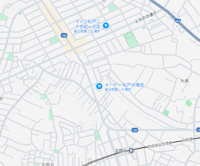 「オーケー 松戸大橋店」は北総鉄道北総線の「北国分駅」から北に徒歩8分の距離に位置する。また同店からさらに8分ほど北には「ライフ松戸二十世紀ヶ丘店」がある。