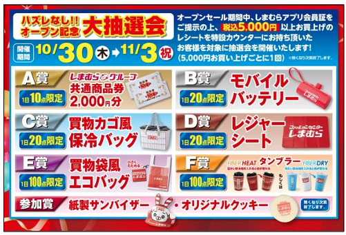 また10/30(木)~11/ 3(月・祝)の期間中、しまむらアプリ会員証を提示して税込5000円以上買い上げた人を対象に、ハズレなしの抽選会を開催する。