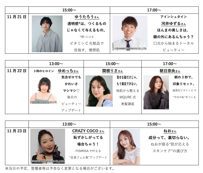 また美容講義では、トレンドの成分にまつわる美容トークやケア方法、PB化粧品の魅力を伝授する課外授業形式のイベントを各日開催する。プレオープン日の20日(木)は EXITのりんたろー。氏、松村沙友理氏、エルフ荒川氏が登場する。その後は以下の通り。