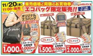 そのほか「MrMax 大野城店」のリニューアルオープンを記念して、11月20日(木)から、販売金額と同額の買物券がついてくる、MrMax創業100周年記念エコバッグを、3000個限定で販売する。買物券は12月1日(月)~1月31日 (土)の期間、