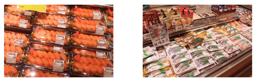 鮮魚コーナーでは、ノルウェー産生アトランティックサーモンを刺身や寿司で、また千葉近隣の漁港で水揚げされ、直送で店舗に届く鮮度抜群な丸魚も取り揃えする。
