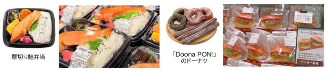 惣菜コーナーでは、一つひとつ丁寧に焼き上げる「出汁がじゅわっと溢れだす玉子焼」や、オリジナルの塩水加工で、ほどよい塩味に仕上げた大ぶりの鮭が自慢の「厚切り鮭弁当」などを取り揃える。ベーカリーコーナーでは、こだわりの惣菜パン「フィッシュフライパーカー」などのパーカー各種や、特設コーナー「Doona PON!」のドーナツなど、焼き立て商品を用意する。