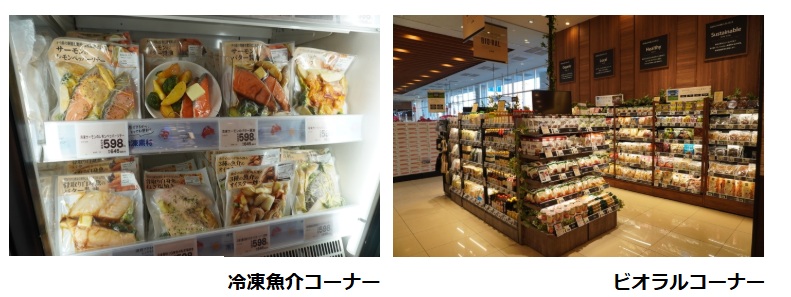 健康志向のニーズに対応するため「ビオラルコーナー」を改装前の1.7倍に拡大。冷凍魚介コーナーは魚介のおいしさをいかした冷凍ミールキットを豊富に取りそろえる。