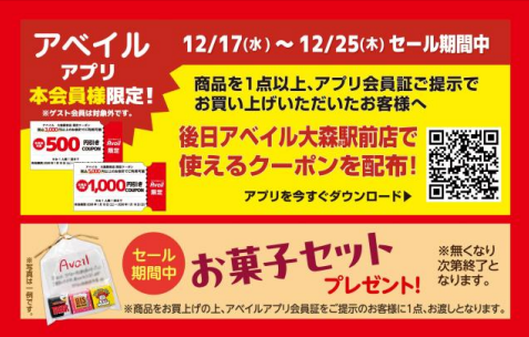 オープンを記念して、12月17日~12月25日のオープンセール期間中、商品を1点以上購入し、さらにアベイルアプリ会員証を提示した会員に、後日「アベイル大森駅前」で使えるクーポンを配布するとともに、お菓子セットをプレゼントする。