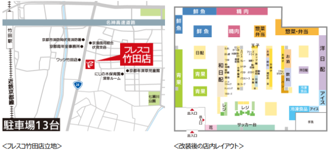立地は、京都市営地下鉄烏丸線・近鉄京都線「竹田駅」より徒歩約 10 分。また、京都市南部と伏見エリアを結ぶ交通利便性の高いエリアで、車でのアクセスも便利な場所にある。竹田店は、15日間の改装期間を設けて、床材変更などの内装工事、設備更新、レジ精算機の増設を行った。