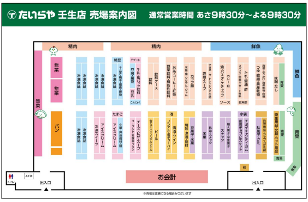 壬生店は出入口を正面の左右に2カ所設け、反時計回りに青果、鮮魚、精肉、惣菜と、コの字型に壁面を構成する。センターゾーンの最終主通路に面した一角は冷凍食品を配置していて、買物をしやすいオーソドックスなレイアウト。壬生店のオープンでたいらやの店舗数は28店舗となった。