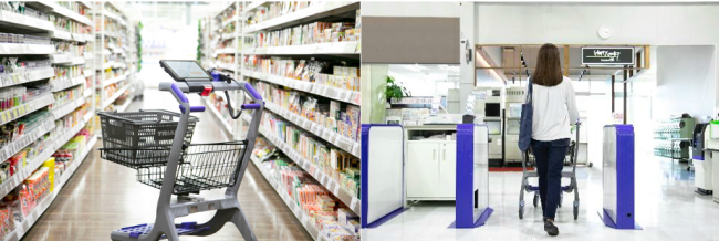 板野店ではセルフレジ機能付きの買い物カート「レジカート」80台、「インストアサイネージ」などのトライアルが独自開発したIoT技術やAI技術を活用した機器を導入している。