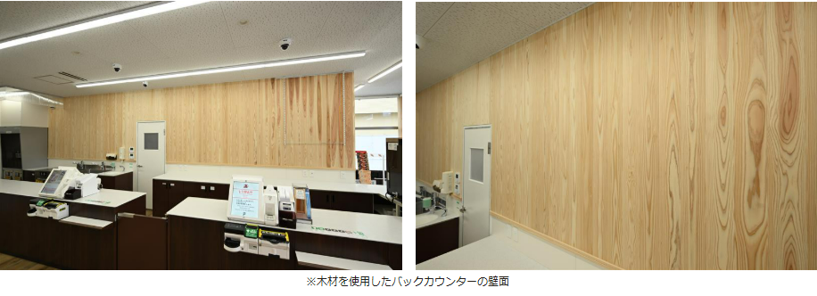 また木材の積極的な活用を通じて、地域資源の循環と環境負荷の低減に取り組む。壁や柱といった内装にも県産の杉を用いることで、木の温かみを感じられる店舗空間に仕上げている。