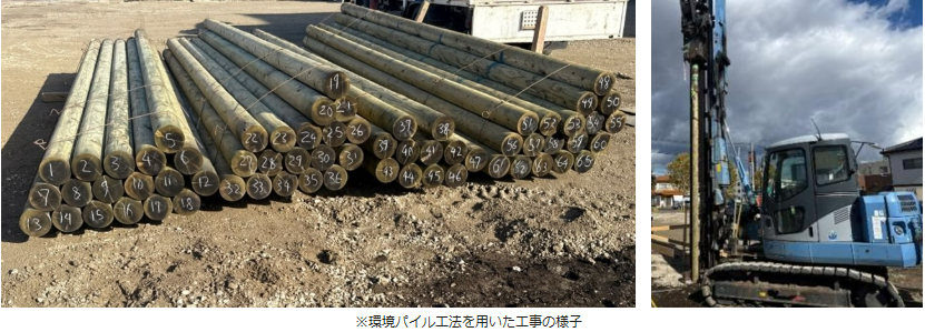 地盤改良では、従来のセメント系工法に加え、県産木材(杉)を用いた木製杭工法(通称:環境パイル工法)を取り入れることで、建設から解体までのライフサイクル全体を見据えたCO2削減に貢献している。