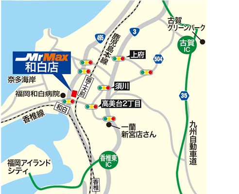 「MrMax Select和白店」は、福岡県内で26店舗目の出店となり、既存の「MrMaxサンリブ古賀店」から南西へ約6km、「MrMax土井店」より北西へ約8kmに位置する。