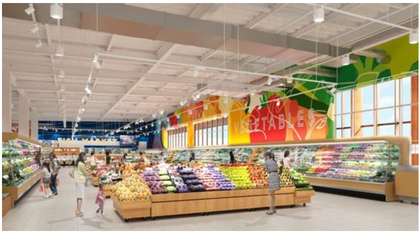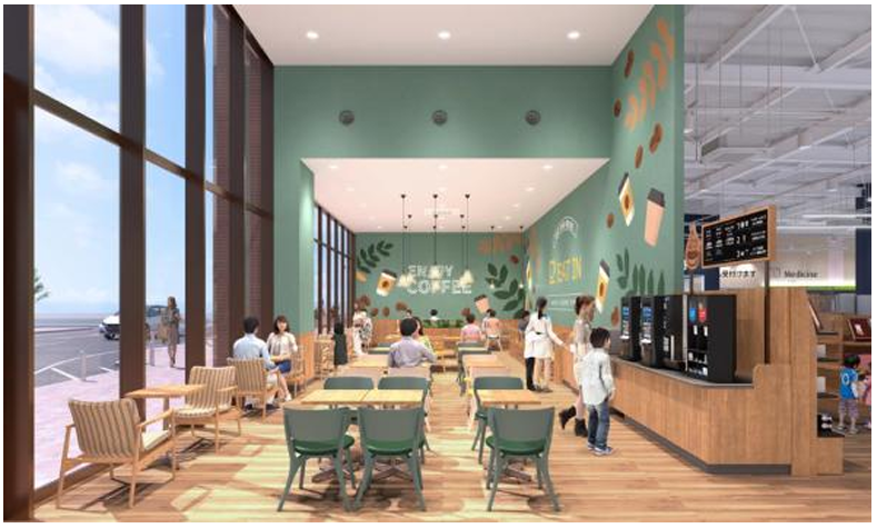 店舗面積は11084坪。食品とヘルス&ビューティケア用品、日用品など日常生活に必要な商品を1フロアに集積したワンストップショッピングできる売場と、くつろぎとコミュニティの場を提案する約50席のイートインコーナーを展開する。また、レジゴーやネットスーパーなど買物の負を解消するサービスも導入する。