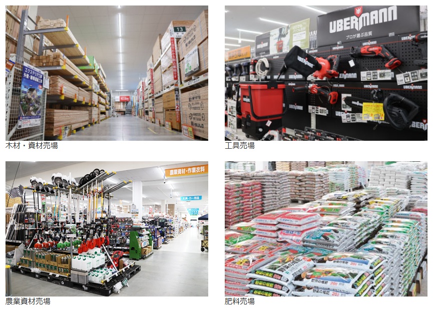 主な取扱い品種/工具・金物、建築資材、農業資材、園芸用品、植物、家庭日用品、ペット用品、インテリア用品、灯油ほか