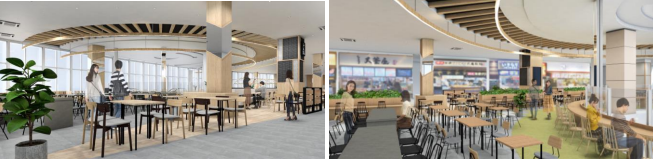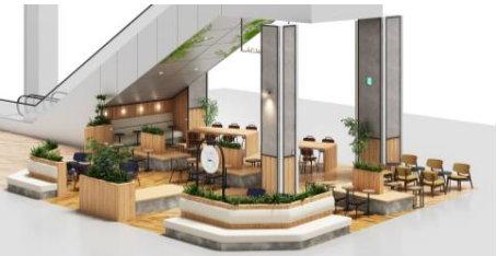 1階にはテイクアウトグルメを気軽に食べられるスペース「あじさいラウンジ」を新設する。木の温かみと明るさのある、くつろぎ空間をつくる。