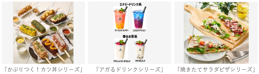 「ファストフードカウンター」では、ワンハンドで食べられる「かぶりつく!カツ丼シリーズ」、オリジナルのエナジーリキッドでつくったオトナリ流「アガるドリンクシリーズ」、野菜の食感が楽しい「焼きたてサラダピザ」をでき立てで提供する。