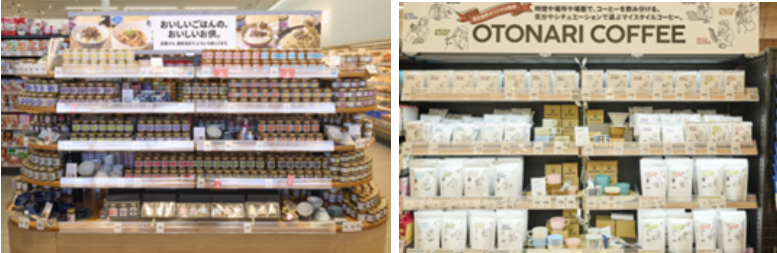 「ごはんのお供」コーナーは、ご飯をおいしく食べる商品やちょい足し、簡便調味料などを提案する。フェースデザインを一新し、伊勢崎下道寺店では29アイテムを展開する。また「オトナリコーヒー」コーナーでは、自社焙煎のオリジナル商品を販売する。豆、粉、ドリップパック、アイスリキッドといった商品から、店内セルフコーヒー売場でのカップ販売まで、幅広く展開する。