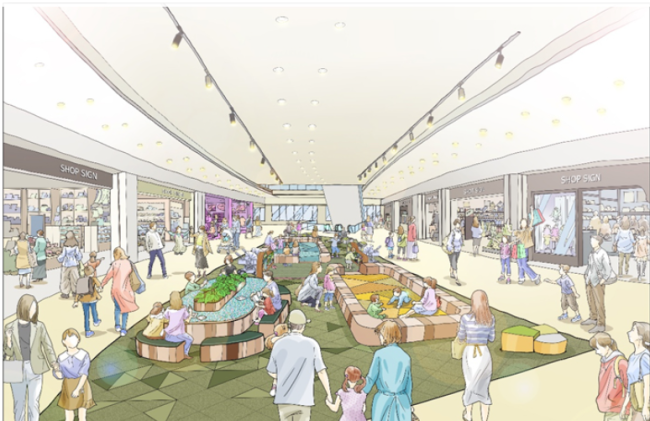 2階ノースカーブモールの共用部は、子どもの成長に合わせて遊べる「こどものあそびば」へ全面刷新する。 年齢別プレイゾーンを設け、親が見守りやすい休憩スペースを整備するなど、ファミリー層の利便性向上を図る。
