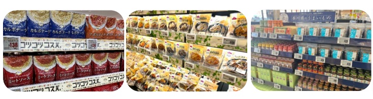 デリカ売場では、白身魚フライやハンバーグ入りの弁当、かつ重など多彩な惣菜を提供。冷凍食品売場では、温めるだけで食べられるワントレー商品や、時短調理に便利な冷凍野菜を揃え、日々の食生活をサポートする。