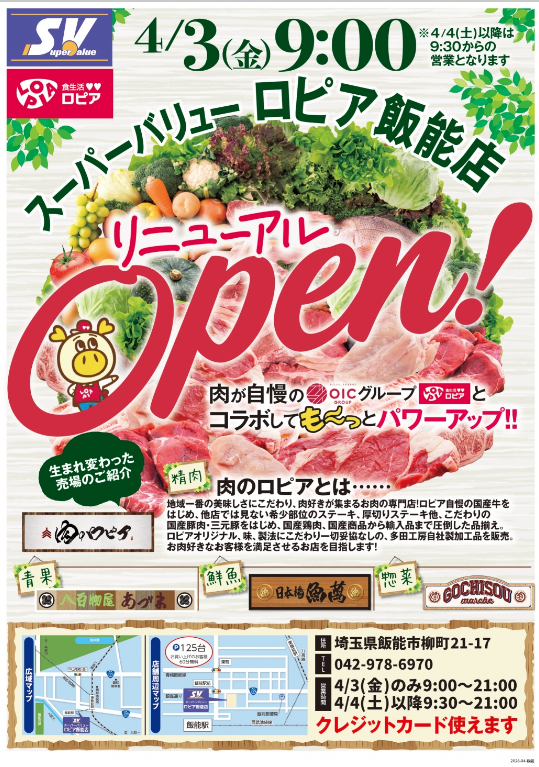 流通スーパーニュース > 店舗 > スーパーバリューnews|3/4ロピアとコラボ「スーパーバリューロピア飯能店」 スーパーバリューnews|3/4ロピアとコラボ「スーパーバリューロピア飯能店」 店舗 / 2026年03月30日 ツイート (株)スーパーバリュー(埼玉県上尾、浜野仁志社長)は4月3日(金)、埼玉県飯能市にある「スーパーバリュー」をリニューアルして「スーパーバリューロピア飯能店」としてオープンする。 3日間の休業期間を設けて改装。ロピアの商品を導入してパワーアップさせる。 ■スーパーバリュー ロピア飯能店 住所/埼玉県飯能市柳町21-17 営業時間/9:30~21:00 駐車場/125台 支払い方法/現金・クレジットカード ツイート