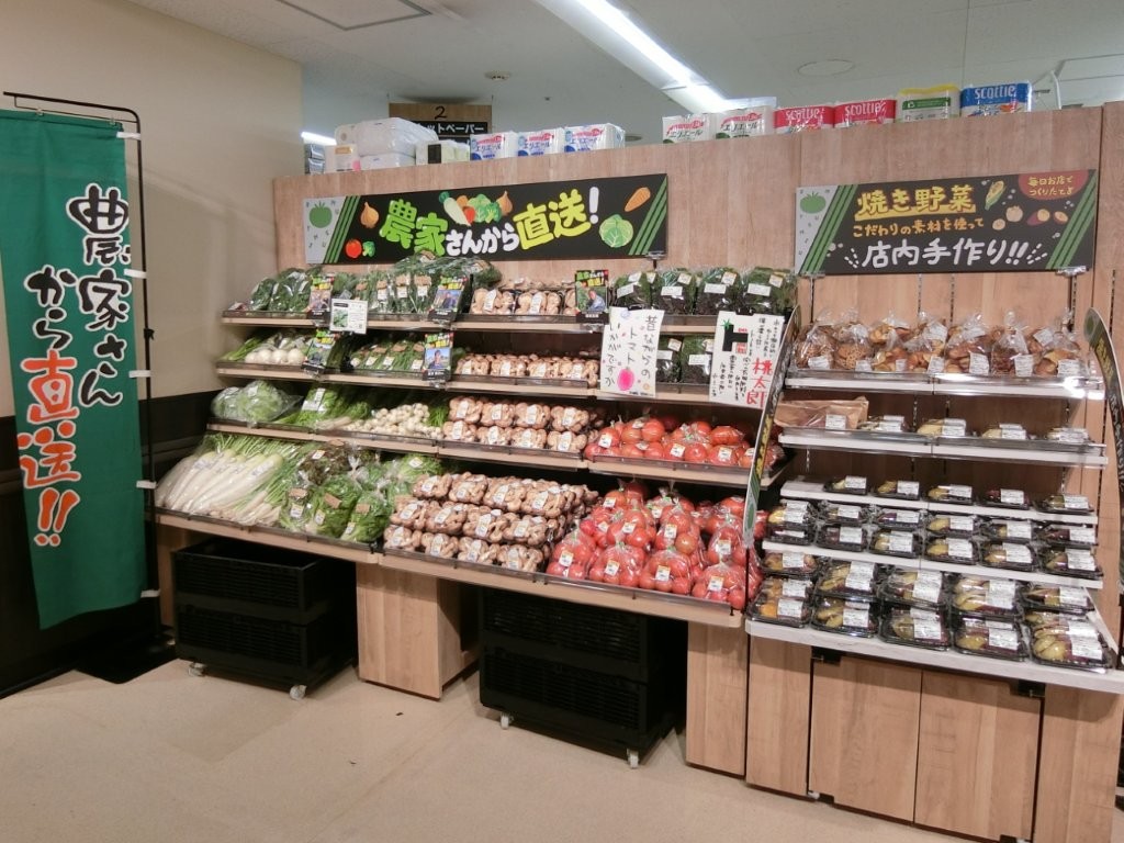 売場構成では、入口に旬の活気を演出する青果売場を配置する。店内手づくりのフレッシュサラダやカットフルーツ、農家直送コーナーを充実させる。
