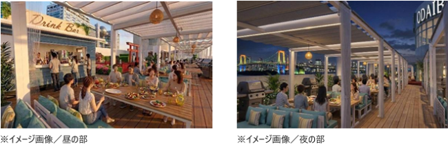 施設はゆりかもめ台場駅から徒歩1分のアクアシティお台場7階に位置し、既存施設「THE BBQ BEACH in AQUA CITY ODAIBA」を全面刷新したもの。従来は団体利用が中心だったが、全席を6名席に変更し、3名から予約可能とすることで、少人数でもレインボーブリッジを望む絶景BBQを楽しめる空間にリニューアルする。