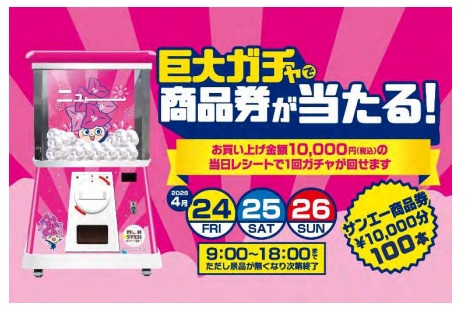 さらにリニューアルオープン記念として、4月 24日(金)~26(日)の3日間、「サンエー商品券1万円分」が当たる企画を開催する。西原シティで税込1万円の購入レシートで、1回ガチャが回せる。
