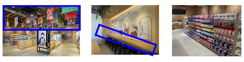 ・コンビニ店舗の天井部に使用していた京都を拠点に活動する染色職人中嶋健氏による47都道府県をイメージした染め物。