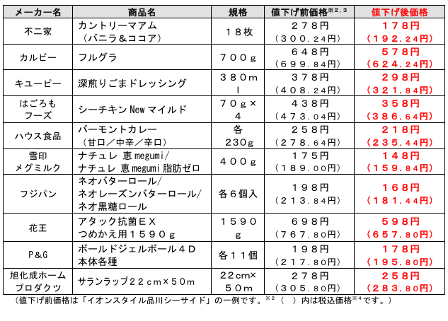 イオン(株)(千葉市美浜区、吉田昭夫社長)は10月20日(月)から26日(日)までの7日間、「イオン」「イオンスタイル」「マックスバリュ」など全国約2000店舗で、菓子、飲料、加工食品、日用品などナショナルブランド69品目を期間限定で値下げしている。