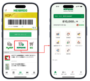 「HOPBANK」は、三菱UFJ銀行の BaaSアプリ基盤「& BANK」を活用したHOP会員専用の銀行サービス。平和堂は、三菱UFJ銀行を所属銀行とする銀行代理業者として各種銀行商品の媒介を行う予定だ。顧客は「HOPBANKアプリ」をダウンロードした後、口座を開設して平和堂のHOPポイント番号と連携すると、「HOPBANKアプリ」を通じた預金・振込・融資などの銀行サービスを利用できるようになる。