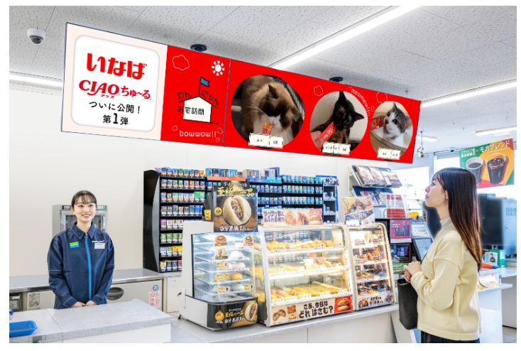 (株)ファミリーマート(東京都港区、細見研介社長)は、全国のファミリーマート約1万600店舗内(一部店舗を除く)に設置されたデジタルサイネージ「FamilyMartVision」において、いなばペットフードの「ちゅ〜る」と、家庭のペットを紹介する人気番組「わんにゃんお宅訪問」がコラボしたユーザー参加型企画「わんにゃんお宅訪問 with ちゅ〜る」の放映を、12月16日(火)から開始する。