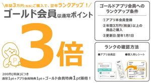 2025年12月31日までに3万円以上の商品を購入すると、2026年1月1日からゴールドアプリ会員へランクアップする。