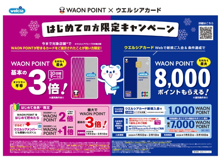 そのほか、Webからウエルシアカードに新規入会すると1000WAON POINTを進呈するほか、発行したウエルシアカードを登録したAEON Pay(ウエルシアカード払い)を1回以上利用し、合計1万円(税込)以上のクレジット払いに利用した場合、最大7000WAON POINTを進呈する。これにより最大8000WAON POINTが受け取れる。
