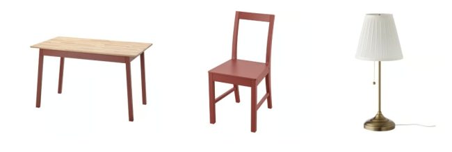 「PINNTORP/ピントルプ」のテーブルはサイズ125x75cmで、1万3990円(税込価格、以下同)、チェアは7000円。「ÅRSTID/オースティード」のテーブルランプは2999円。