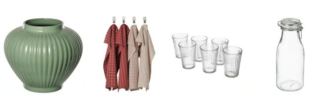 「PELARBJÖRK/ペーラルビョルク」の花瓶は2499円、「RINNIG/リンニング」のキッチンクロスは399円/4ピース、「VARDAGEN/ヴァルダーゲン」のグラス:31clは799円/6ピース、「KORKEN/コルケン」のボトル型ふた付き容器1Lは 399円。