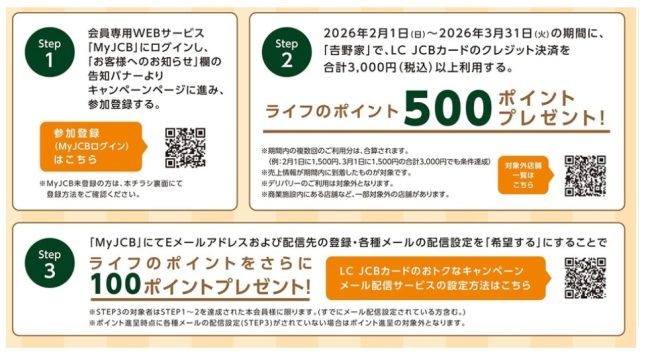 キャンペーンに参加するには、①会員専用WEBサービス「My JCB」からエントリーが必要、②吉野家の対象店舗で「LC JCBカード」を合計で税込3000円以上利用する、③「My JCB」でEメールアドレスおよび配信先の登録メールの配信設定を「希望する」にする。条件を満たして参加すると、ライフのポイントが最大600ポイントもらえる。
