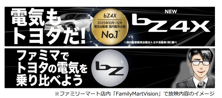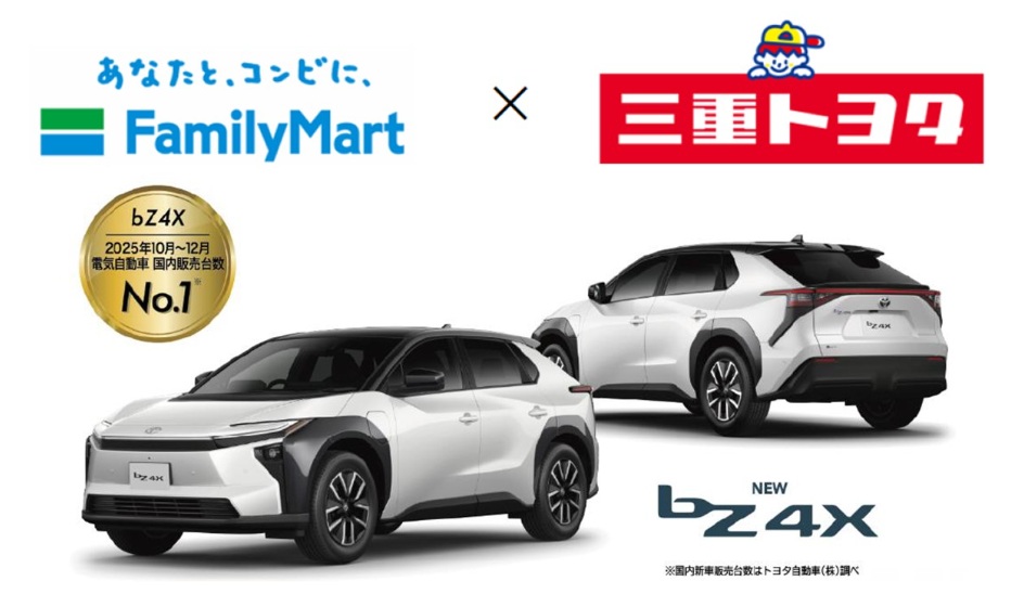 (株)ファミリーマート(東京都港区、細見研介社長)は、三重トヨタ自動車(株)(三重県津市、竹林憲明社長)と共同で、トヨタの新型電気自動車「bZ4X」(ビーズィーフォーエックス)などの試乗会を、3月6日(金)・7日(土)に三重県内のファミリーマート5店舗で開催する。